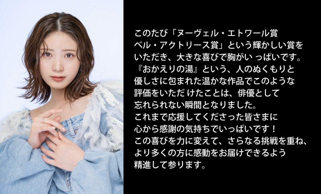 2025/10/01 星乃 夢奈さんヌーヴェル・エトワール賞 ベル・アクトリース賞受賞!! ゆうばり国際ファンタスティック思い出映画祭2025特別上映「おかえりの湯」に出演、星乃夢奈さんがヌーヴェル・エトワール賞 ベル・アクトリース賞を受賞いたしました!ご本人より受賞コメントも届きました!