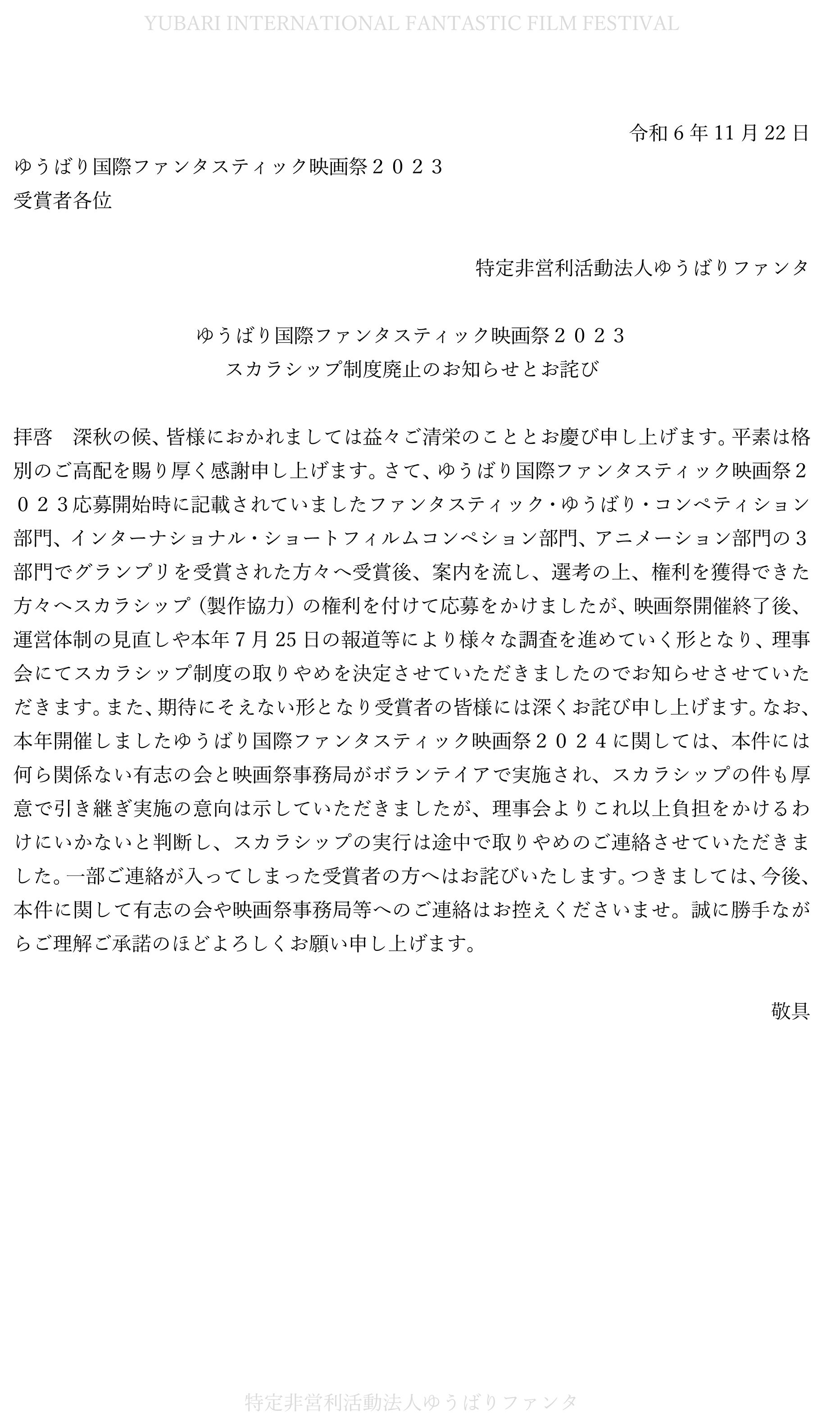スカラシップ制度廃⽌のお知らせとお詫び